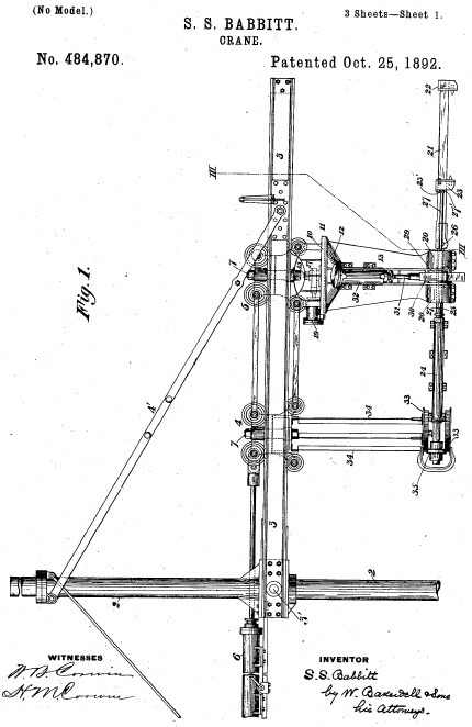 Seward Babbitt of Pittsburgh patented a rotary crane with a motorized gripper—designed specifically for removing hot ingots from furnaces.